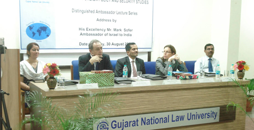 GNLU marked another milestone in its journey towards contributing to legal infrastructure to the nation, when it inaugurated the Distinguished Ambassador Lecture Series. His Excellency Ambassador Mr Mark Sofer, Ambassador of Israel to India, inaugurated the series by delivering an address on Indo-Israel Political, Economic and Security Relations in the Next Decade on Monday, 30 August 2010. The Israeli delegation included Ambassador Sofer, Mrs. Oran Sagiv, Consul General of Israel in Mumbai and Ms. Sharon Rappaport, Second Secretary, Political Affairs, Embassy of Israel in New Delhi.