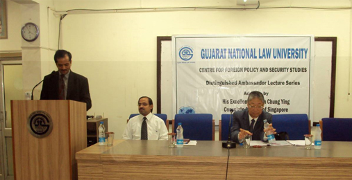 Mr. Lin Chung Ying, Consul-General, Singapore High Commission, Mumbai, and Ms Chan Kah Mei, First Secretary (Economic Affairs), Singapore High Commission visited the GNLU and delivered a lecture on the Indo-Singapore Bilateral Relations to the GNLU community, under the auspices of the GNLU Centre on Foreign Policy and Security Studies (GCFPSS).